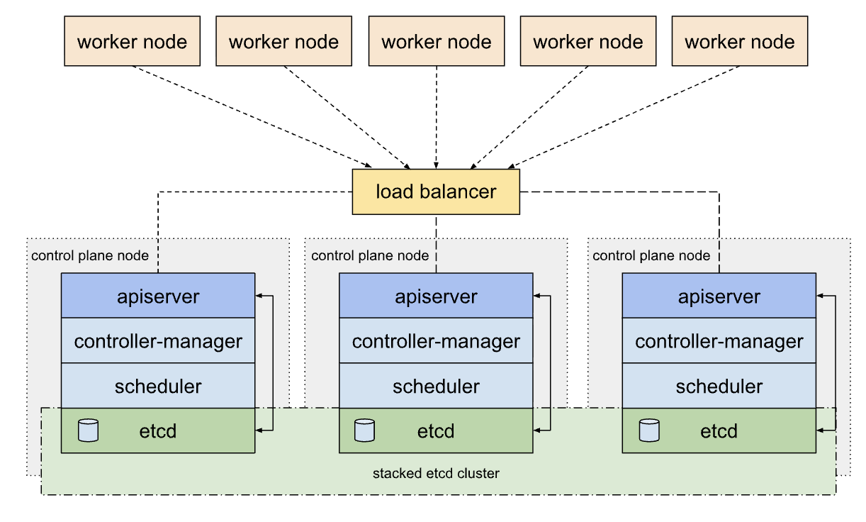 각 컨트롤 플레인 노드는 지역 etcd 맴버를 생성하고 이 etcd 맴버는 오직 해당 노드의 kube-apiserver와 통신한다. 즉, 컨트롤 플레인과 etcd 맴버가 같은 노드에 묶여 있다.