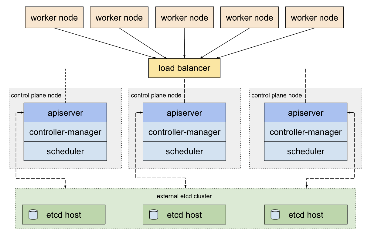 이는 etcd를 control plane과 분리하기 때문에 control plane 장애에 etcd가 영향을 받지 않는다. 대신 etcd cluster를 구성하기 위해 Stacked etcd topolocy에 비해 호스트 개수가 2배나 필요하다. (최소 6대)